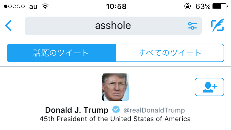 Twitterのキーワード検索はプロフィールなどに検索された用語が使われていると、表示されやすくなるが、トランプ大統領のプロフィールにはassholeやracistなどの単語は使用されていない。