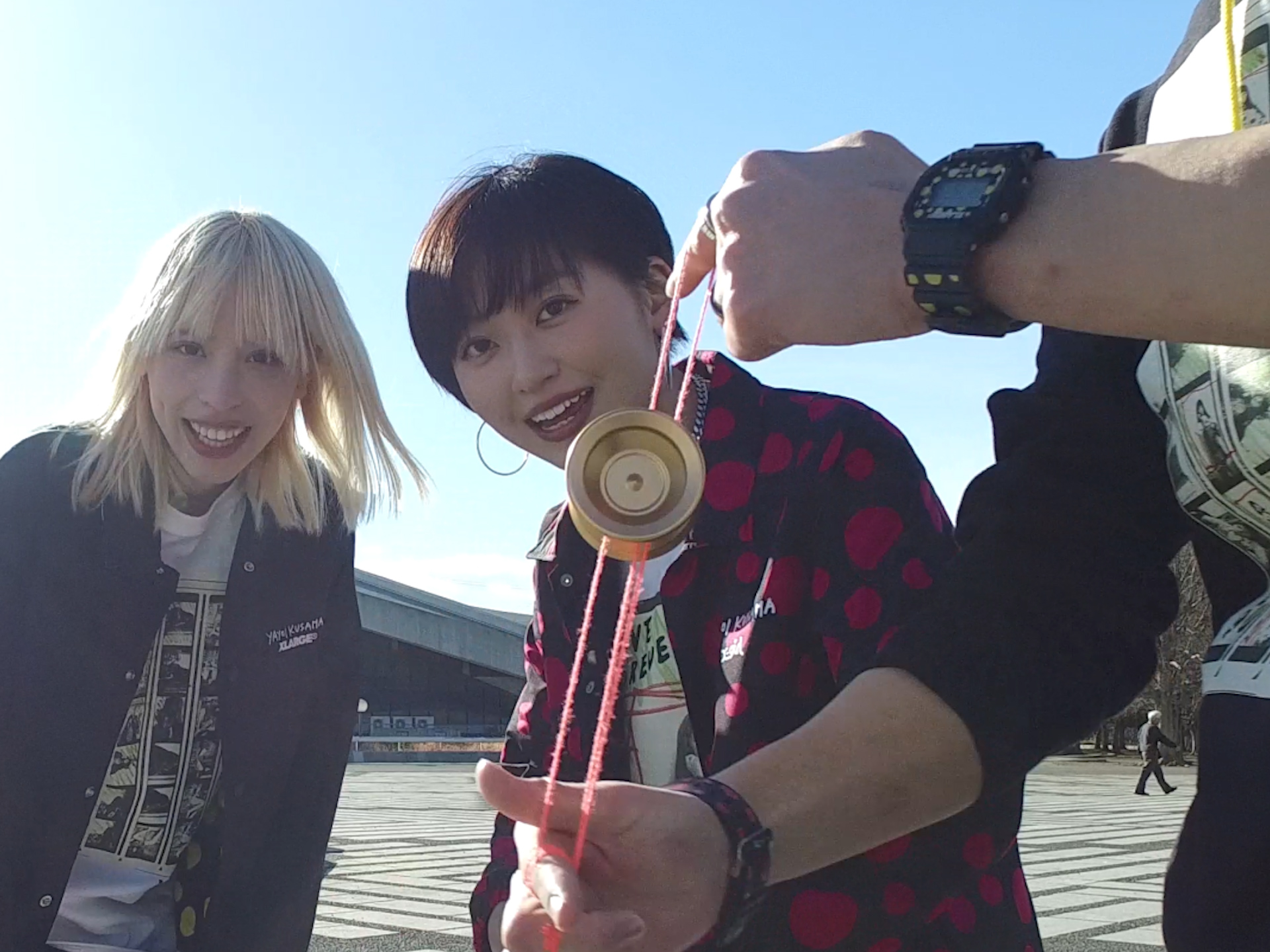 草間彌生さんのモチーフである「水玉」を暗喩して、画面の中心に常に丸い物体を置いてトラッキングし映像を構成しています。アイテムの丸いロゴや水玉の模様とも映像をつないでいます。映像の質感はスパイクジョーズが監督した90’sのミュージックビデオやスケートのムービーにインスパイアされ、あえて少し粗い映像の質感にする事で90‘sの雰囲気を表現しました。(古屋蔵人)