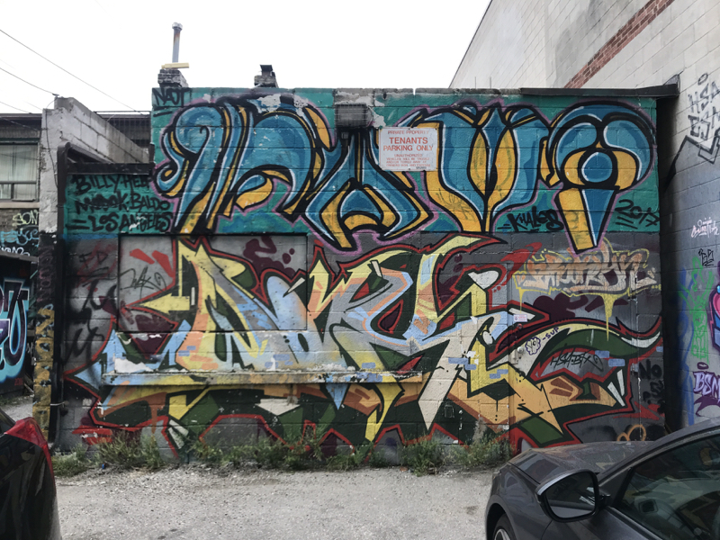 そして、トロントのパブリック・アートの真骨頂とも言えるのがグラフィティ・アレーです。クイーン・ストリート・ウエスト地区を中心に広がるこのエリア、もともとはラッシュ・レーン(Rush Lane)という名の通りだったそうですが、自治体が公式にグラフィティを認め、その後、グラフィティ・アレー(Graffiti Alley)と改名したそう。