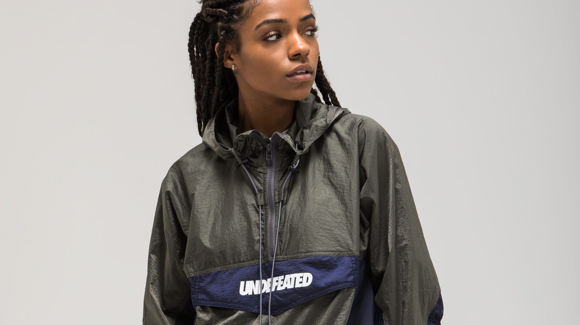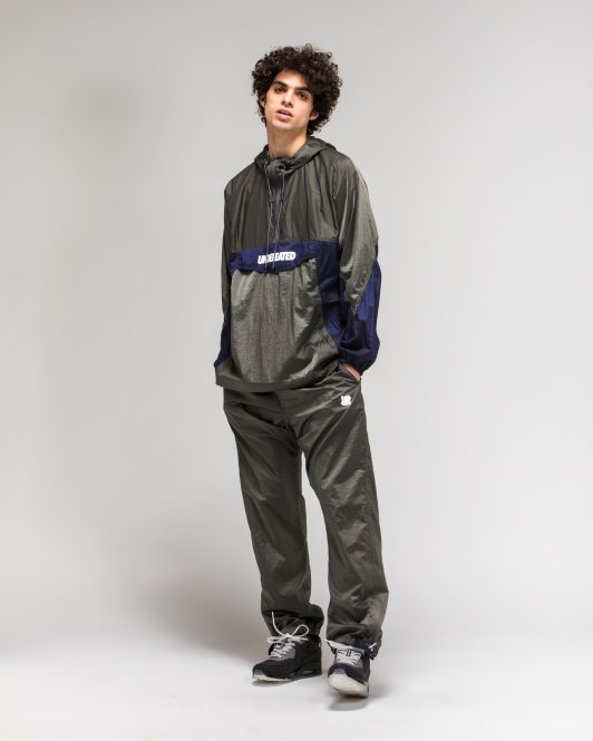 薄くて軽いナイロン素材を使用したアノラックジャケットは、独特な光沢感とシワ感のある生地の質感と切り替えを多用したシルエット、長く伸びたフードのドローコードが主張するデザインが特徴。ホワイトでプリントされたUNDEFEATEDのロゴがフロントで映える。同素材のMETALLIC TRACK PANTも裾にジップとストラップを付け、シルエットの調整や脱着をイージーに。ライニングにはメッシュを採用し穿き心地を向上した逸品。他にもMETALLIC STRAPBACK、METALLIC TOTE BAGも同素材で登場する。