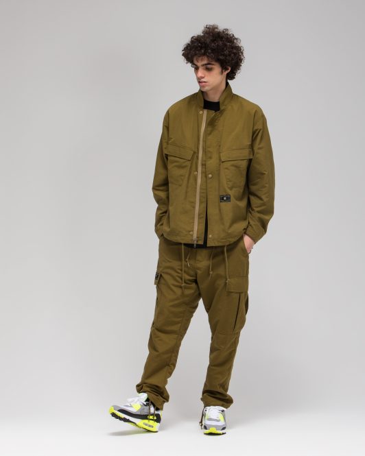 撥水性に優れたナイロンポプリン生地を用いたジャケットとカーゴパンツ。斜めにレイアウトされたフロントポケットやシンプルなロゴプリント、フロントのタグなどミリタリーテイストが感じられる1着で、フロントのダブルジップに加え、ライニングにメッシュを貼るなど着心地や使い勝手を考慮した仕上がり。カーゴパンツは無骨なアイテムながら、細身のシルエットで洗練さをプラスし、ライニングにメッシュを貼ることで着心地を向上している。