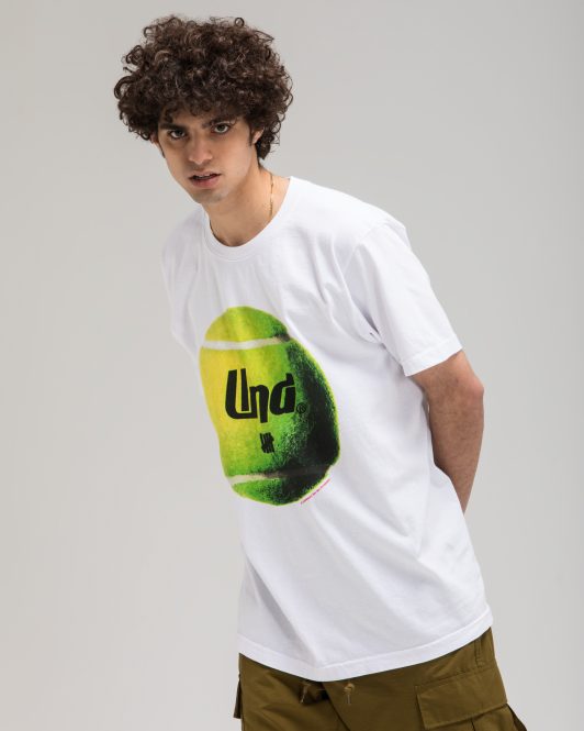 毛の一本まで見えるような精緻なテニスボールをフロントに大胆にプリントしたTシャツ。テニスボールにはundとファイブストライクスロゴを焼き印で表現。バックはロゴとともに「GAME.SET.MATCH.」というテニス用語をプリント。