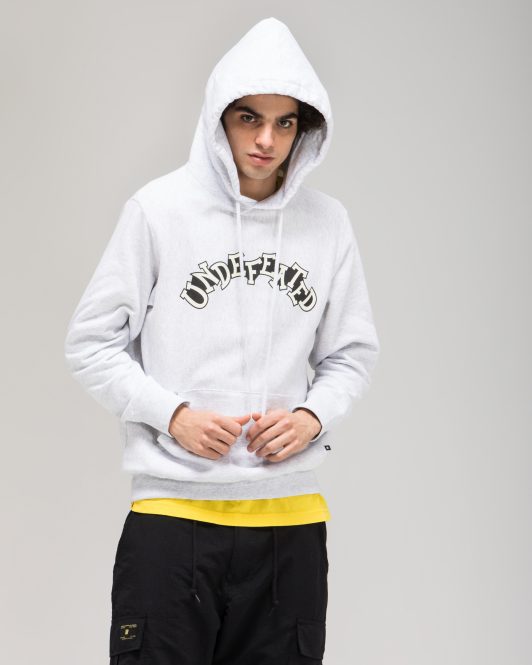 左胸にプリントされたビル群とランナーの足のグラフィック、ロゴプリントがUNDEFEATED主催による仮想シティマラソンのオフィシャルTシャツをイメージしたアイテム。バックにはLAのダウンタウンを彷彿とさせるビル群とUNDEFEATED RUN 2020を大胆にレイアウト。また、フロントにアーチロゴをプリントしたパーカーは、ランダムに崩れた文字の配置が目を引くデザイン。カンガルーポケットの左サイドにはブランドを象徴する5本線ロゴ、ファイブストライクスのピスネームを採用。素材やシルエットにこだわったオリジナルボディもポイントとなっている。