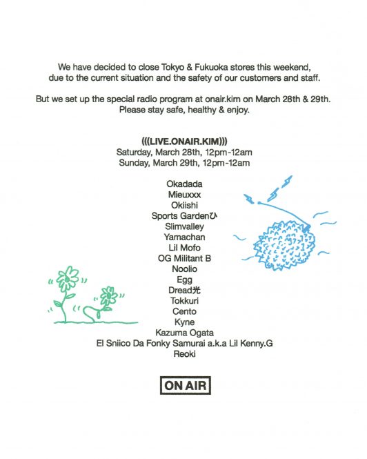 本来は東京と福岡の店舗の営業予定日だった、この2日間。安全を考慮し営業を中止する代わりにON AIRのメンバーや関係の深い仲間たちが昼12時から12時間連続で番組を行う。