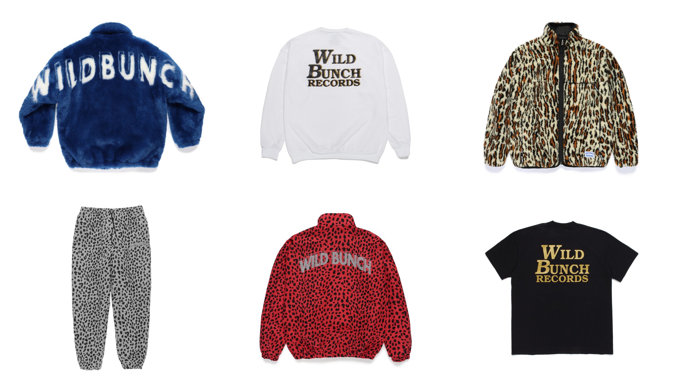WILD BUNCHのオフィシャルロゴをファーコーチジャケットのバックに表現したコーチジャケットや。WACKO MARIAオリジナルのレオパード柄のトラックジャケットのセットアップ、リバーシブルジャケット、スウェット、TシャツにもWILD BUNCHのオフィシャルのロゴをプリントや刺繍で表現している。