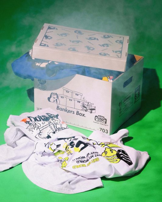 新作アート作品の展示・販売に加え、アートワークを落とし込んだ Tシャツやスウェットのアパレルアイテム、FELLOWES社製のバンカーズボックスなどのスペシャルなアイテムも発売となる。