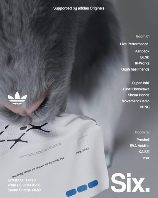 2018年に発足した同世代の4人から構成されるクリエイティブ集団Sound Sportsとadidas Originalsによるイベント『Six.』が、4/18(金)に渋谷 Circus Tokyoで開催される。