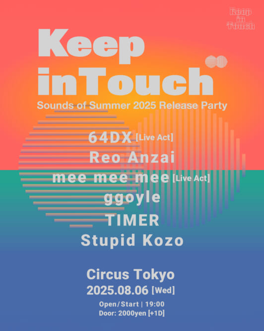 本楽曲も収録されるKeep in Touchのコンピレーションアルバムは8/1(金)にリリース予定、同作の発表にあわせてのパーティーが8/6(水)にCircus Tokyoで開催されることが決定、今後が期待されるプロジェクトのアーティストのショーケースをいち早く目撃できる絶好のチャンスとなるため、この機会をお見逃しなく。