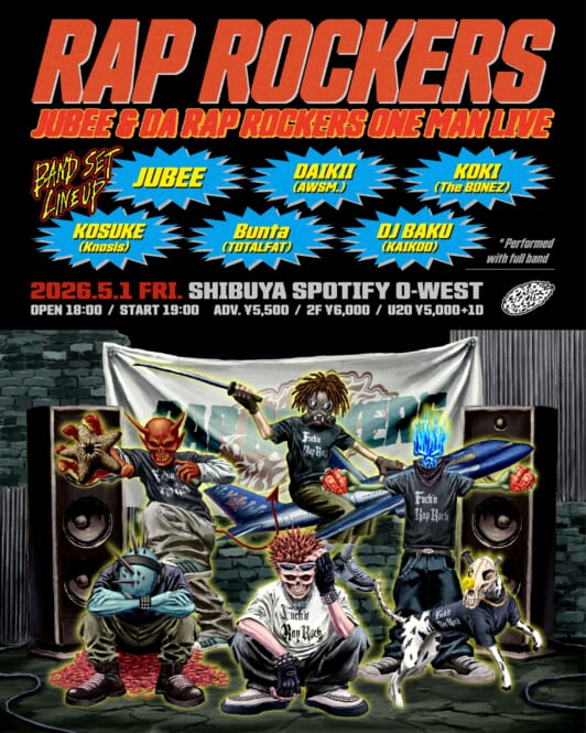 JUBEEが自身初のフルバンドセットでのワンマンライブ『RAP ROCKERS -JUBEE & DA RAP ROCKERS ONE MAN LIVE-』を5/1(金)に渋谷 Spotify O-WESTにて開催する。